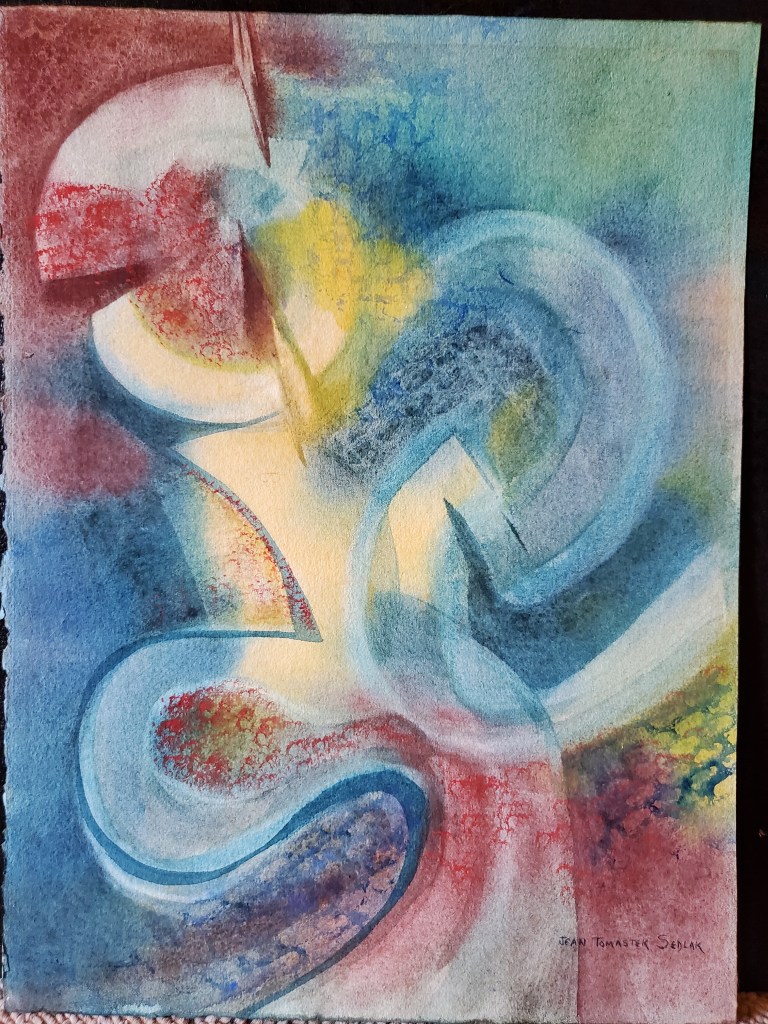 Abstract with blue, yellow, & red by Jean Tomastek Sedlack, Signed Abstract with blue, yellow, & red by Jean Tomastek Sedlack, Signed Need Measurement. It is Medium size. Unframed