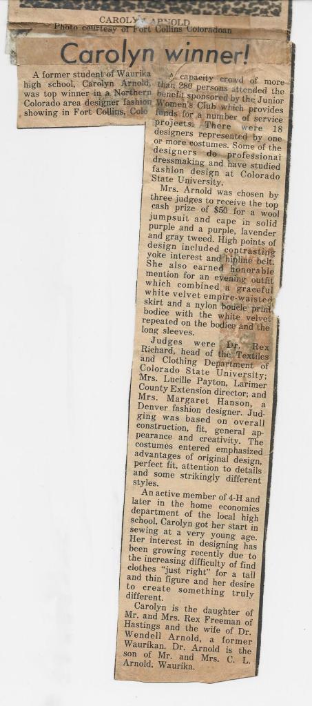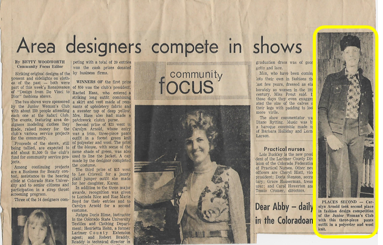 https://youtu.be/laAcf2mixLg Featuring clothes that my mom, Carolyn Arnold, won awards for designing and making in the 1970’s in Ft. Collins, Colorado, and the respective newspaper articles. Share this: Click to email a link to a friend (Opens in new window) Email Click to share on WhatsApp (Opens in new window) WhatsApp More Click to share on Facebook (Opens in new window) Facebook Click to share on X (Opens in new window) X Click to share on LinkedIn (Opens in new window) LinkedIn Click to share on Reddit (Opens in new window) Reddit Click to share on Tumblr (Opens in new window) Tumblr Click to share on Pinterest (Opens in new window) Pinterest Click to share on Pocket (Opens in new window) Pocket Click to share on Telegram (Opens in new window) Telegram Like Loading...