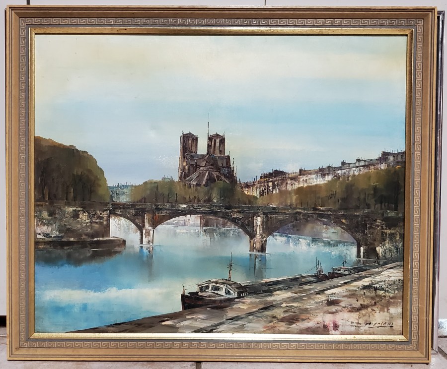 Original Painting – Notre Dame Cathedral in Background, Water and Boat, Signed, (looks like) Imzaki