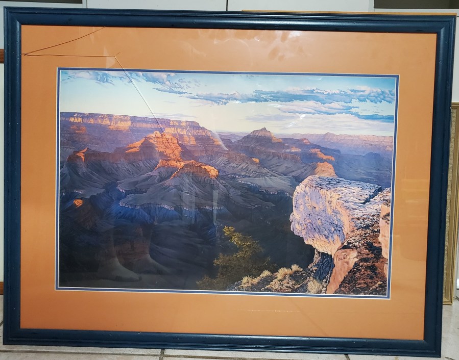 Western Landscape (looks like) Brulil, Signed Western Landscape (looks like) Brulil, Signed 38 ½ x 29 ½ Dark Green Frame Glass is broke – needs new glass.