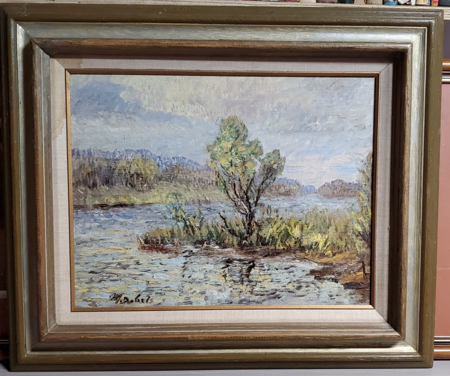 Original Painting – River and Bank with Tree in the Middle (looks like) M. Babel, Signed