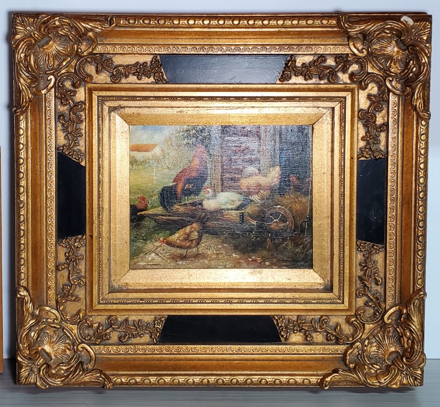 Original Painting – Hens and Rooster by Unknown Original Painting – Hens and Rooster by Unknown 20 ½ x 19 Ornate Frame, Gold and Black