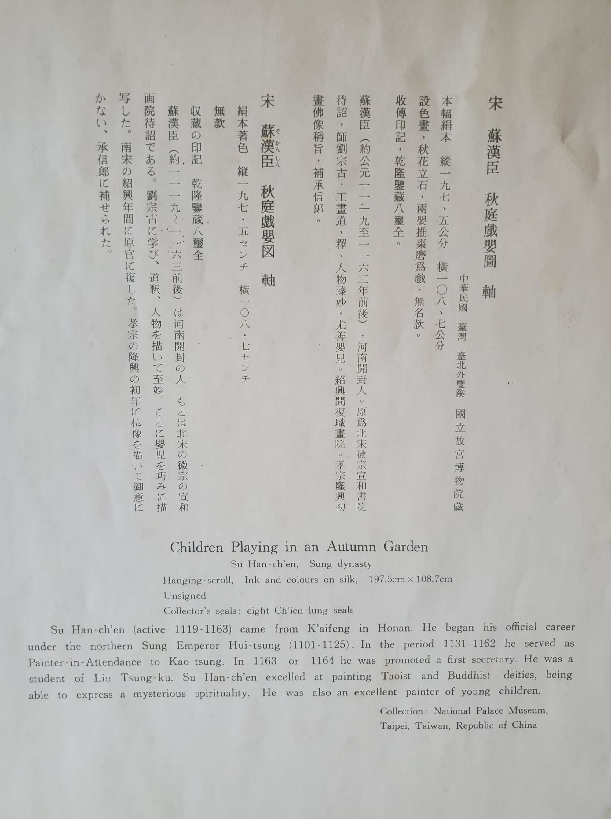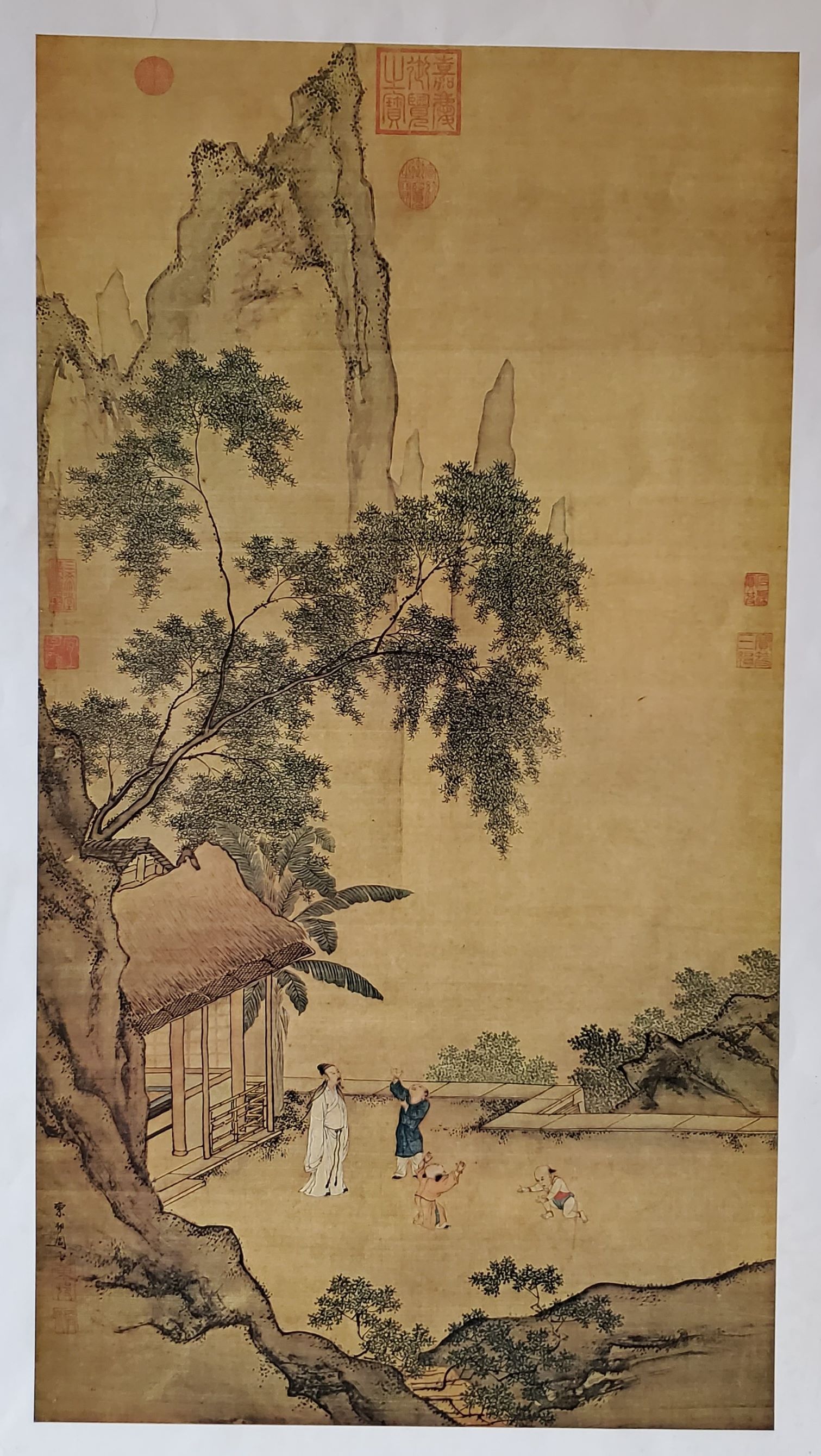 Reproduction hanging scroll from Sung Dynasty obtained from National Palace Museum. Unsigned. Has 3 collector’s seals. Unframed. 14 1/2″ W x 20 1/2″ H.