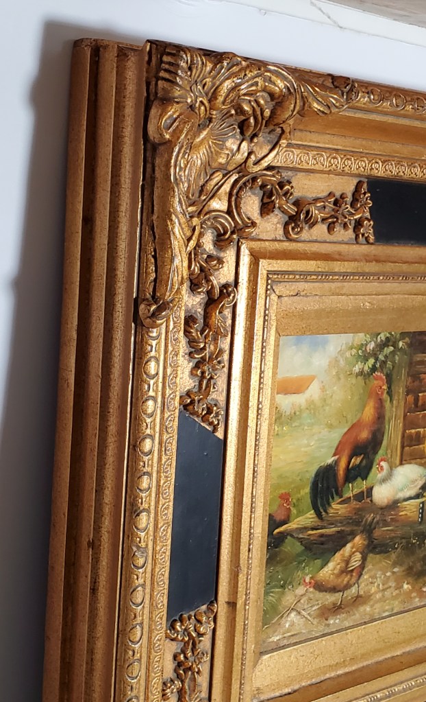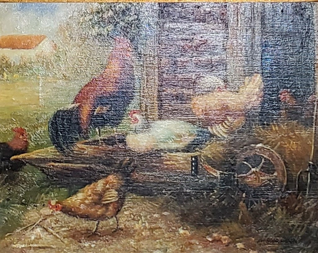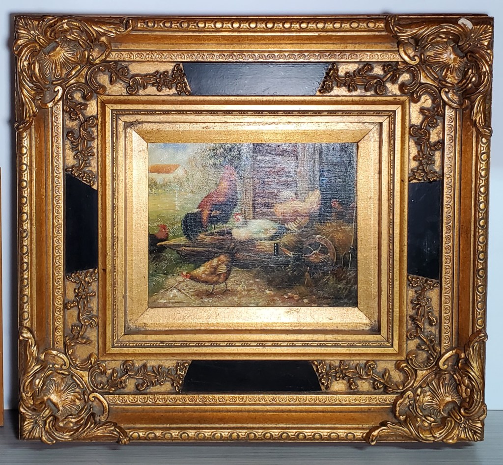 Hens and Rooster Painting Original painting by unknown artist of hens and rooster in ornate gold and black frame. 20 1/2″ W x 19″ H. Asking $50 Price is for local pick-up only. Shipping is extra and will be figured upon request. See below for contact details. Click here to return to where you were on the “Items for Sale” page. Clicking the back button will put you at the top of the page, while Clicking this button will return you to where you left off. Share this: Click to email a link to a friend (Opens in new window) Email Click to share on WhatsApp (Opens in new window) WhatsApp More Click to share on Facebook (Opens in new window) Facebook Click to share on X (Opens in new window) X Click to share on LinkedIn (Opens in new window) LinkedIn Click to share on Reddit (Opens in new window) Reddit Click to share on Tumblr (Opens in new window) Tumblr Click to share on Pinterest (Opens in new window) Pinterest Click to share on Pocket (Opens in new window) Pocket Click to share on Telegram (Opens in new window) Telegram Like Loading...