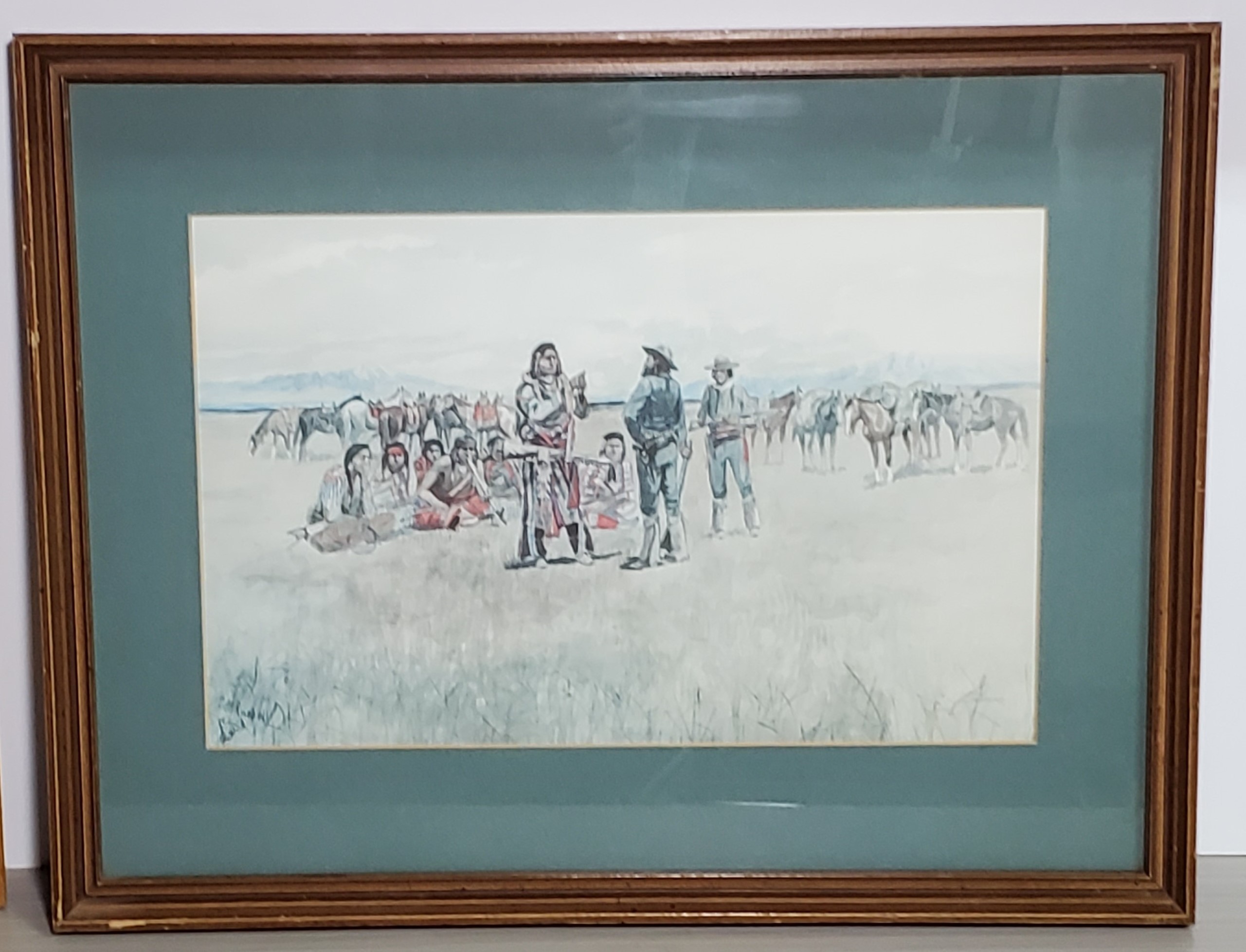 “Cowboys and Indians Talking on the Plains” by C M Russell, Signed