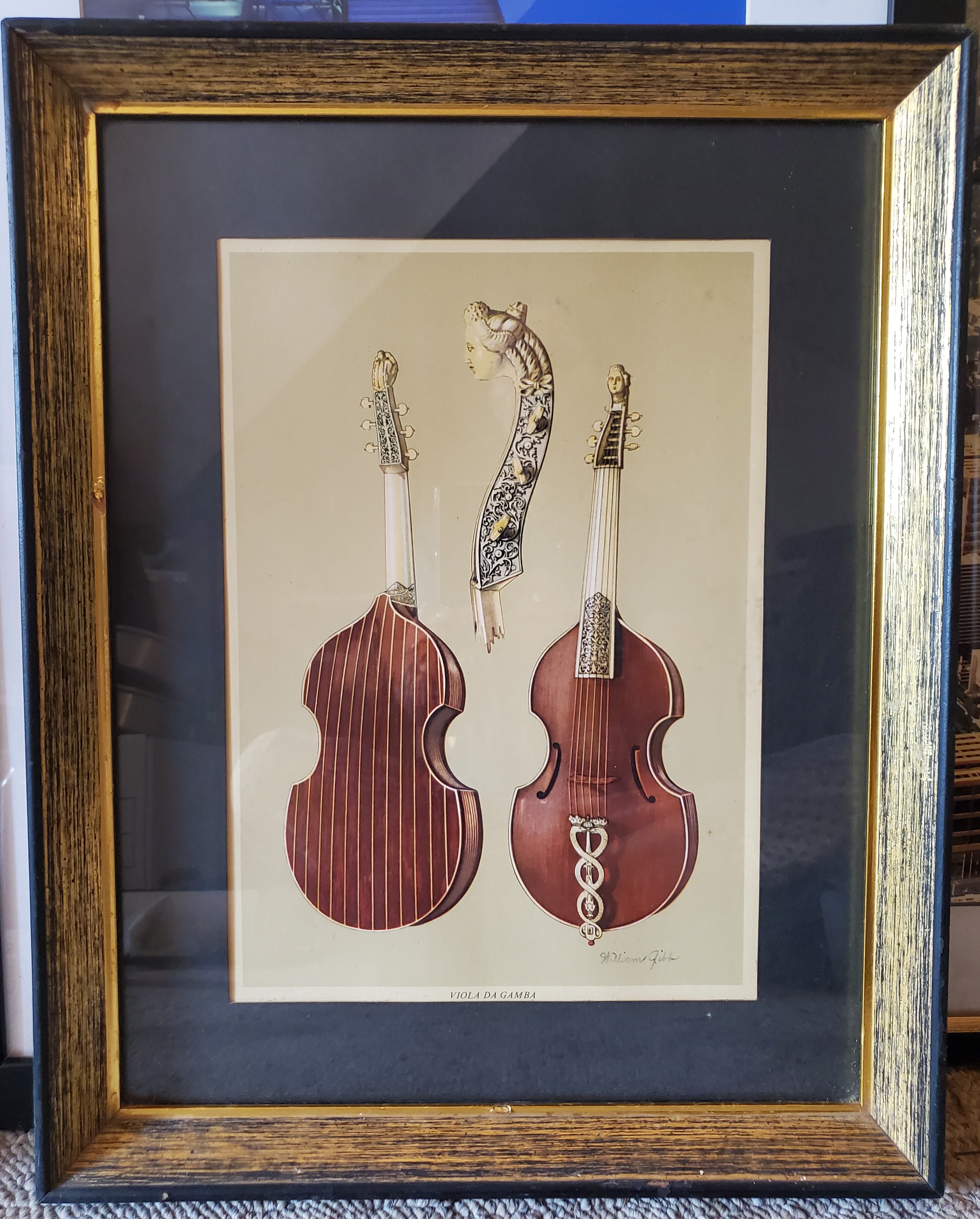 Viola da Gamba by William Gibb, Signed. 14″ W x 18″ H. Frame color is gold and black.