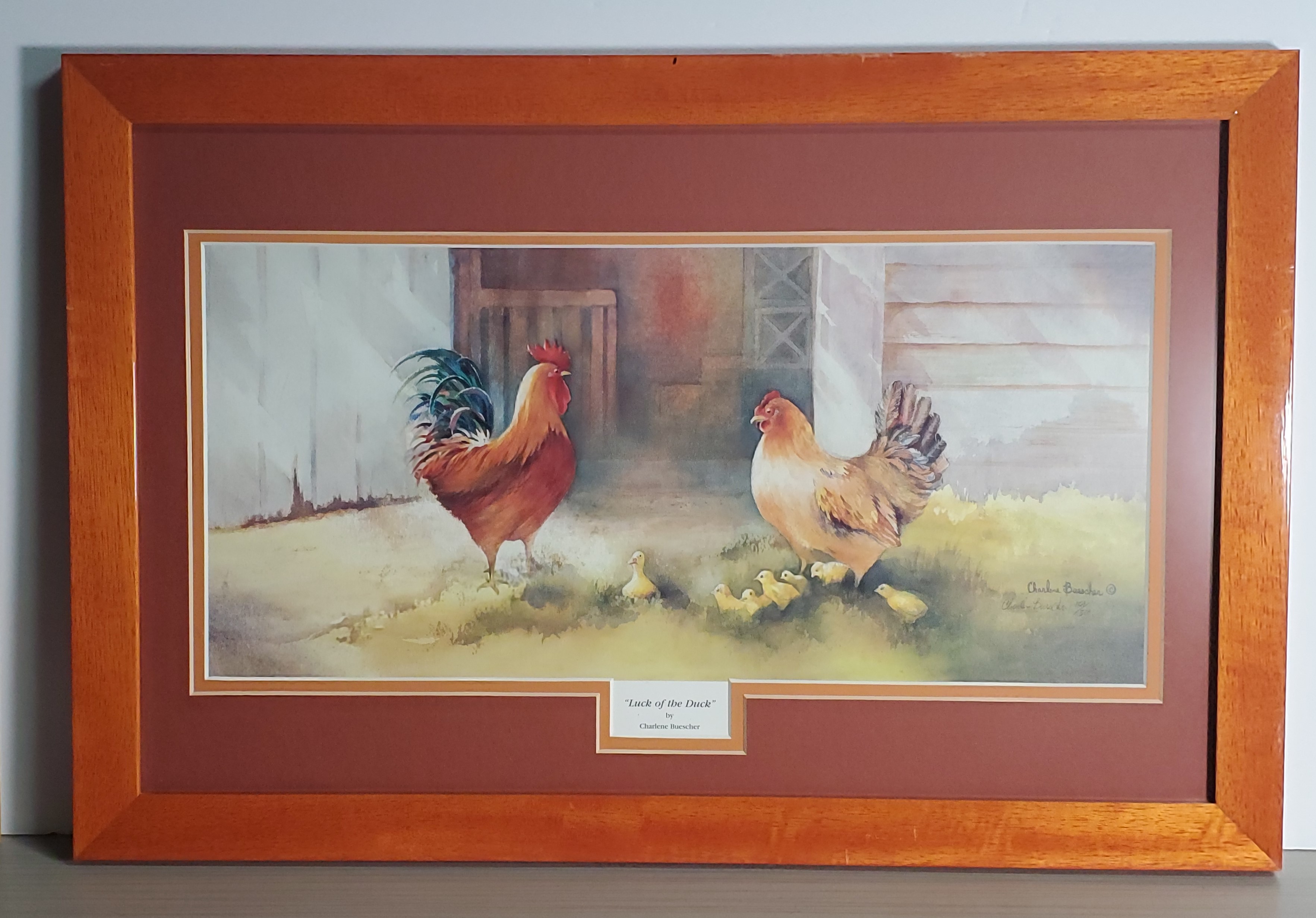 “Luck of the Duck” by Charlene Buescher, Signed. 21″ W x 14″ H. Frame is a shiny wood.