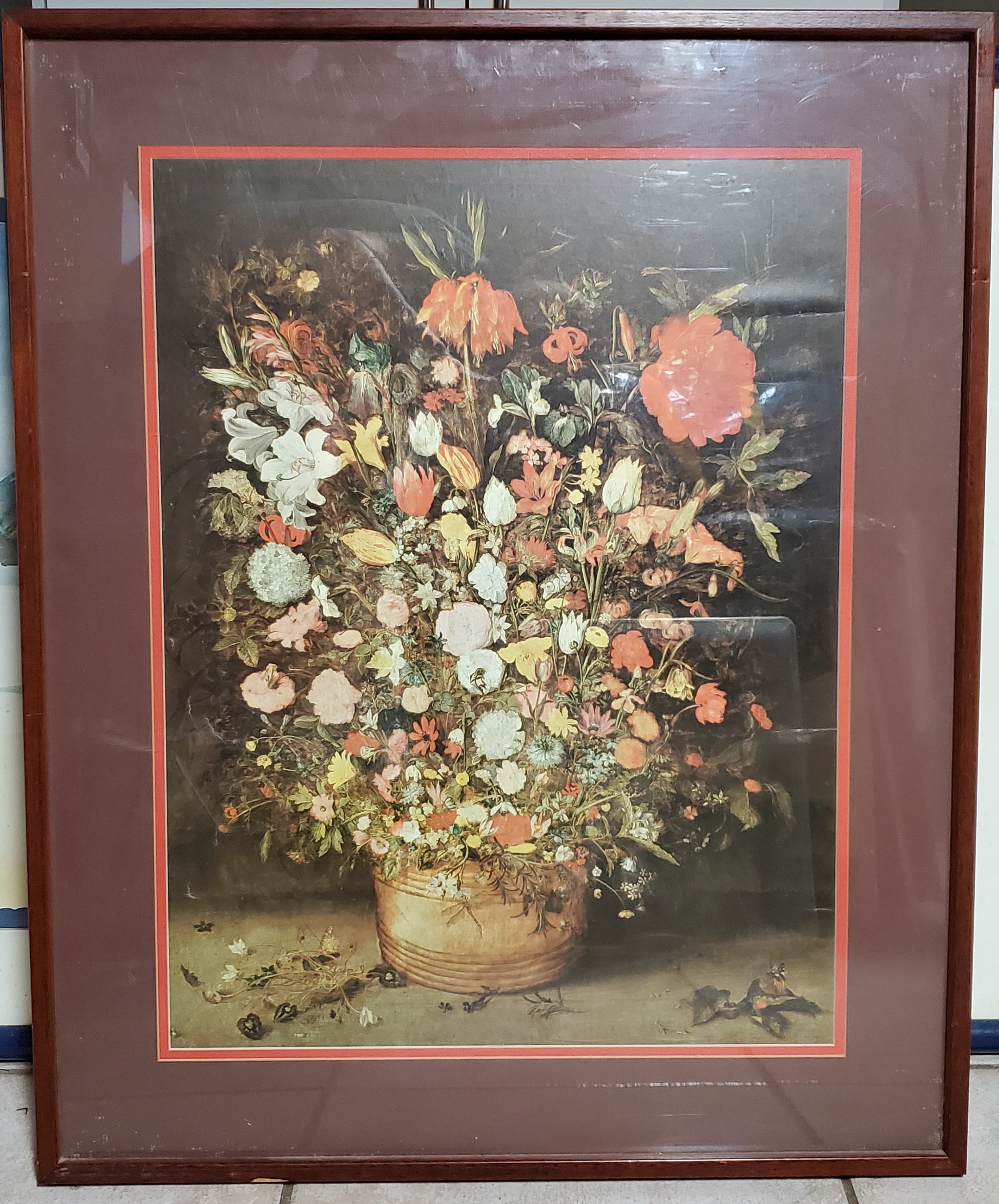 “Still Life of Flowers in a Wooden Tub” by Jan Breughel, Signed. 27″ W x 33″ H. Frame is brown.