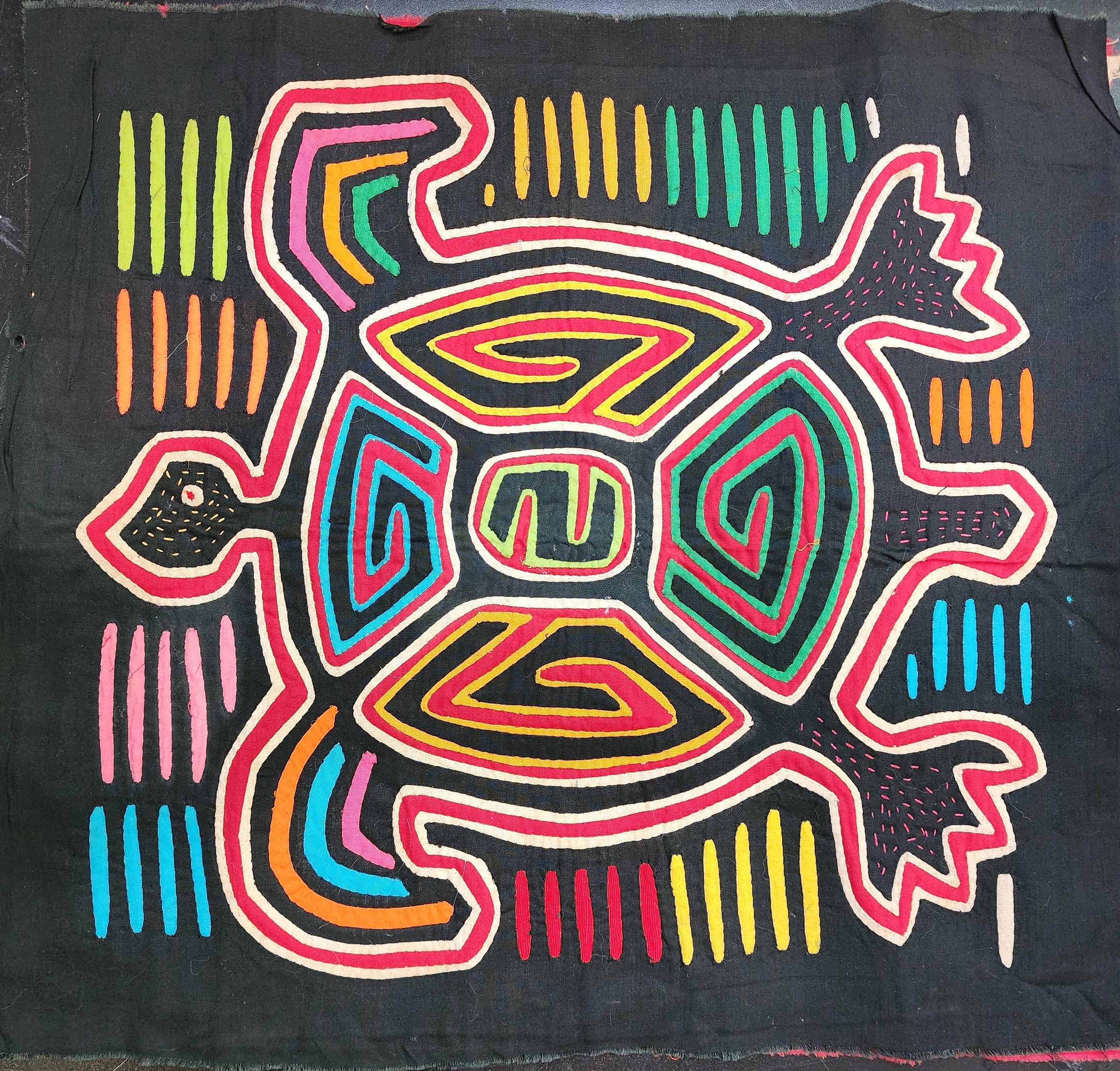 Abstract by Native American Artist Oscar Howe, Signed. Wyld Gallery calls it “War Dancer.” 18″ W x 17″ H. Frame color is a cross between bronze and gold.