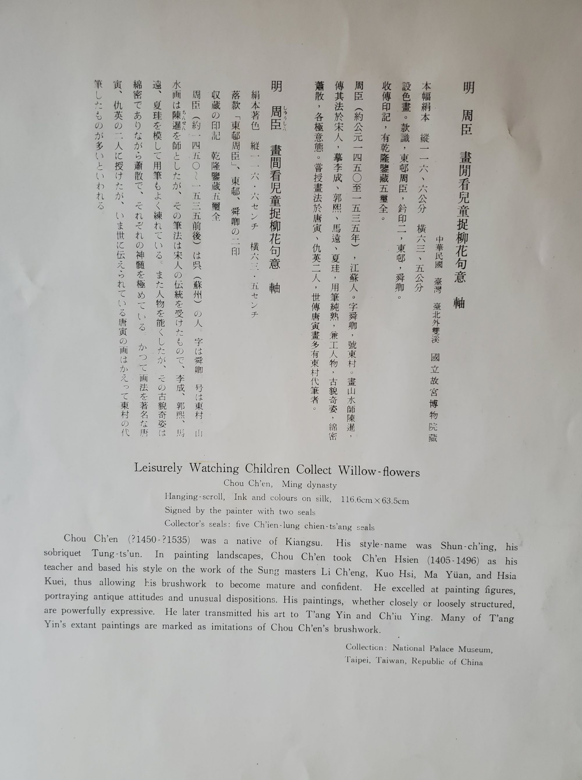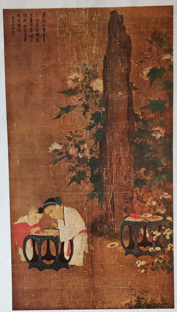 Reproduction hanging scroll from Ming Dynasty obtained from National Palace Museum. Signed by painter with 2 seals. Has 5 collectors seals. 14 1/2″ W x 20 1/2″ H.