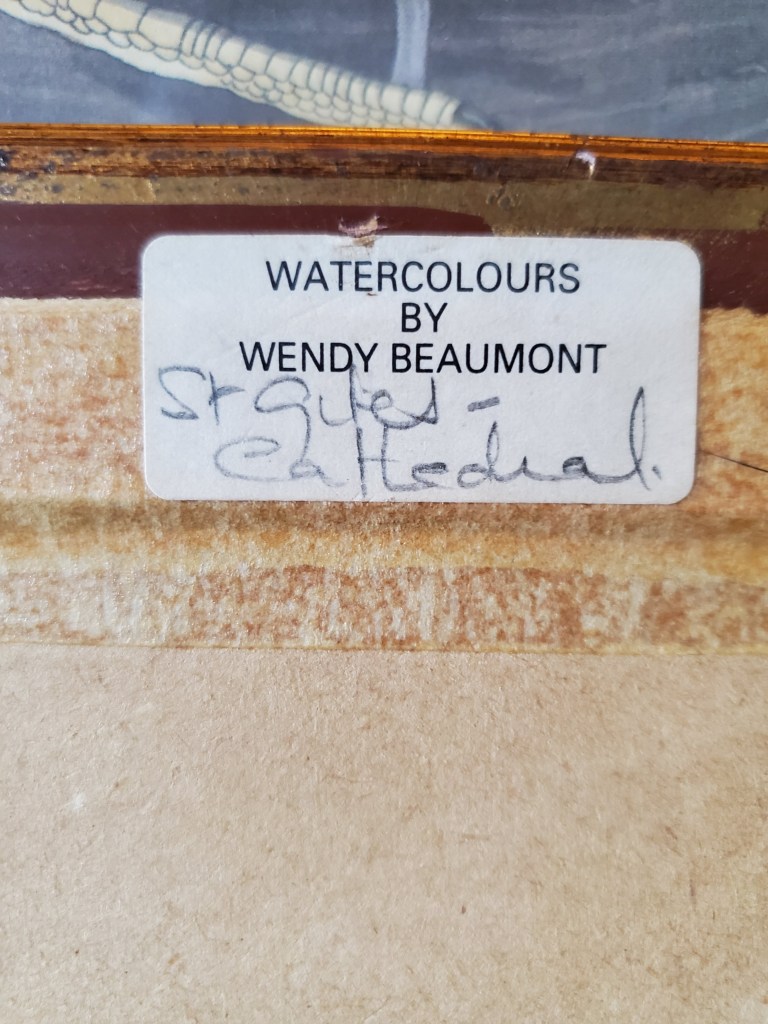 St. Giles’ Cathedral by Wendy Beaumont, signed Framed Watercolor of St. Giles’ Cathedral in Scotland. Signed. 8″ W x 9″ H. Asking $50 Price is for local pick-up only. Shipping is extra and will be figured upon request. See below for contact details. Click here to return to where you were on the “Items for Sale” page. Clicking the back button will put you at the top of the page, while Clicking this button will return you to where you left off. Share this: Click to email a link to a friend (Opens in new window) Email Click to share on WhatsApp (Opens in new window) WhatsApp More Click to share on Facebook (Opens in new window) Facebook Click to share on X (Opens in new window) X Click to share on LinkedIn (Opens in new window) LinkedIn Click to share on Reddit (Opens in new window) Reddit Click to share on Tumblr (Opens in new window) Tumblr Click to share on Pinterest (Opens in new window) Pinterest Click to share on Pocket (Opens in new window) Pocket Click to share on Telegram (Opens in new window) Telegram Like Loading...