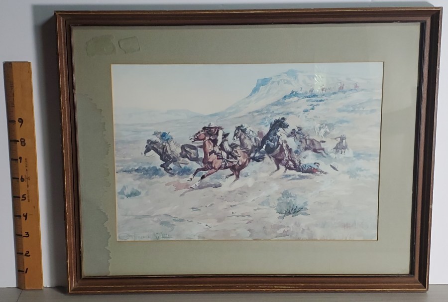 “Surprise Attack” by CM Russell, Signed Signed print. Framed. 19″ W x 15″ H. Asking $30 Price is for local pick-up only. Shipping is extra and will be figured upon request. See below for contact details. Click here to return to where you were on the “Items for Sale” page. Clicking the back button will put you at the top of the page, while Clicking this button will return you to where you left off. Share this: Email a link to a friend (Opens in new window) Email Share on WhatsApp (Opens in new window) WhatsApp More Share on Facebook (Opens in new window) Facebook Share on X (Opens in new window) X Share on LinkedIn (Opens in new window) LinkedIn Share on Reddit (Opens in new window) Reddit Share on Tumblr (Opens in new window) Tumblr Share on Pinterest (Opens in new window) Pinterest Share on Telegram (Opens in new window) Telegram Like Loading...
